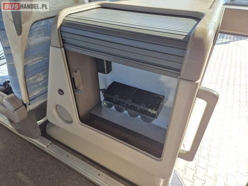 Wyposażenie: video, WC, lodówka, caffebar, fotele odchylane, oświetlenie indywidualne, siateczki, ABS, tempomat, retarder, podnóżki, stoliczki, mikrofon, klimatyzacja, radio, regulacja wysokości nadwozia, centralny zamek, podwójne szyby boczne, wspomaganie kierownicy, elektryczne lusterka, DVD, ogrzewanie stacjonarne